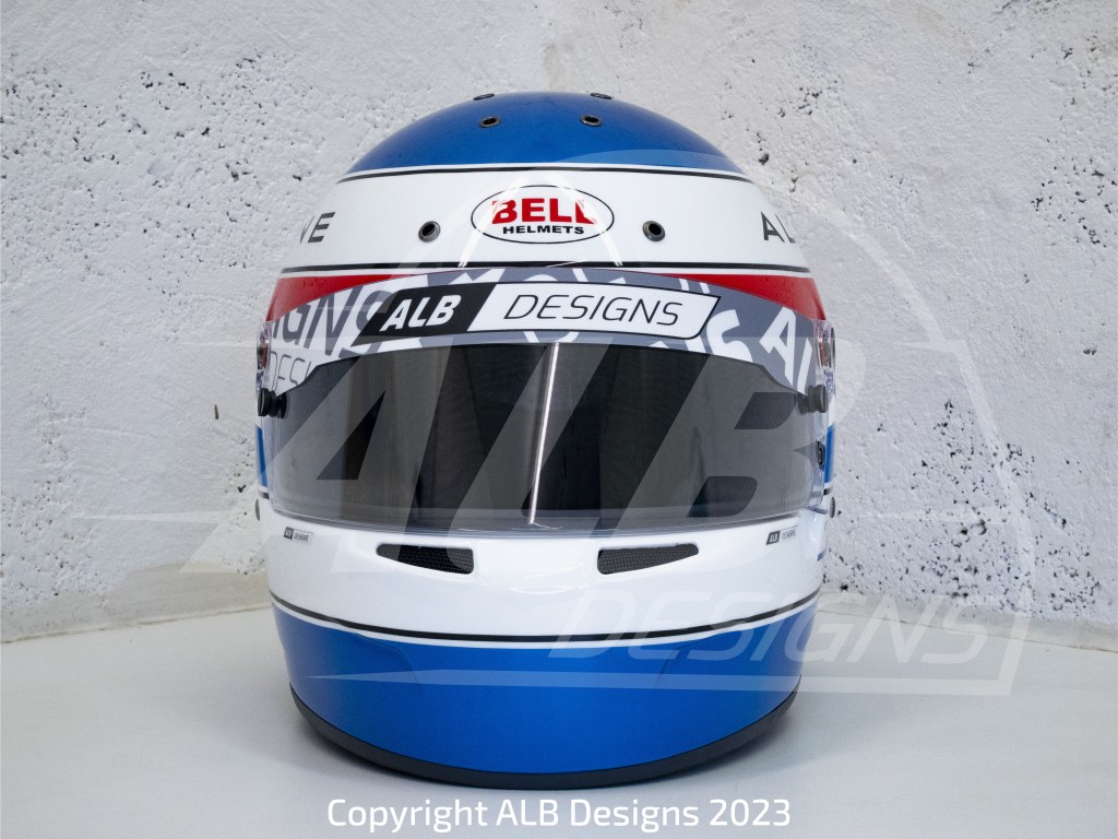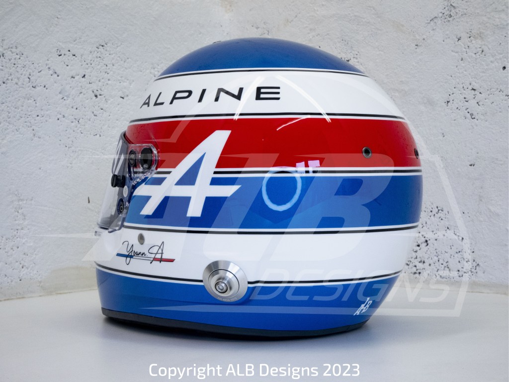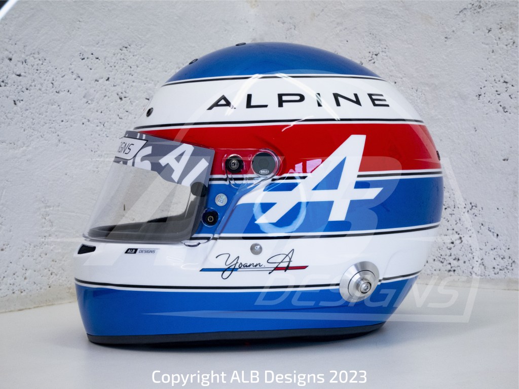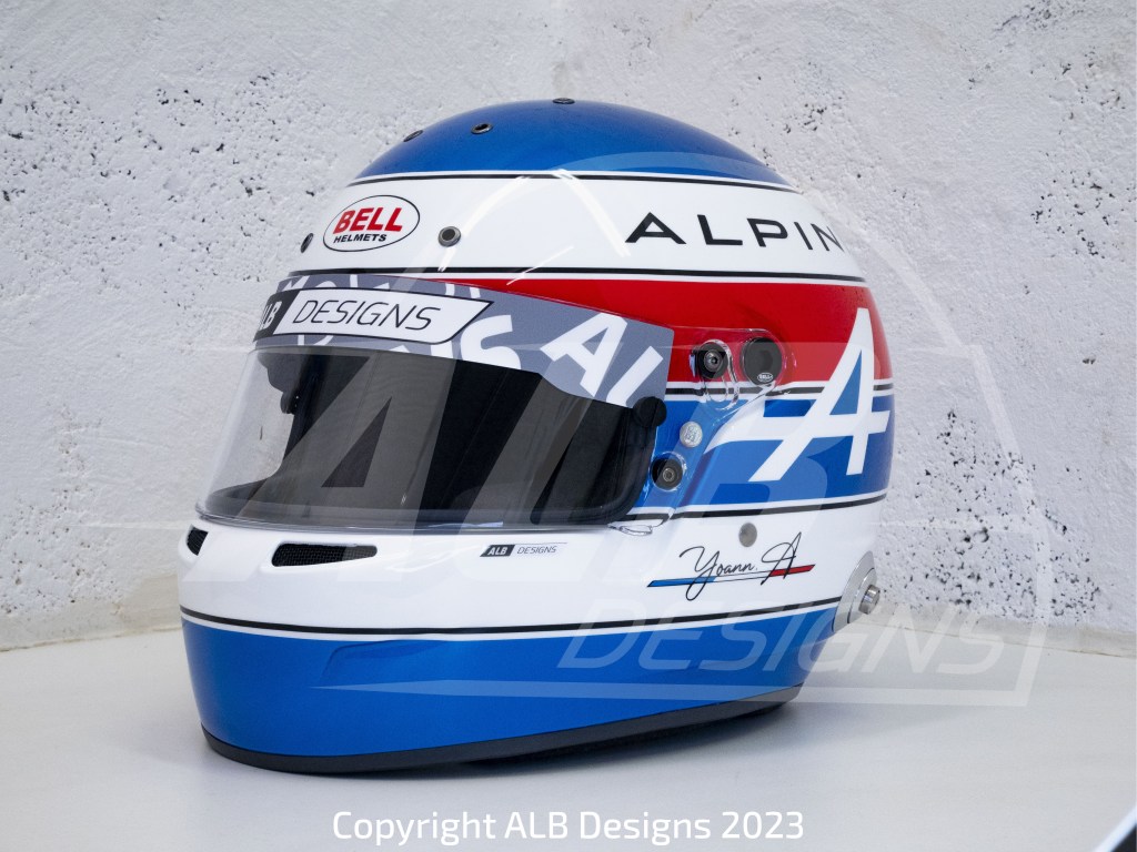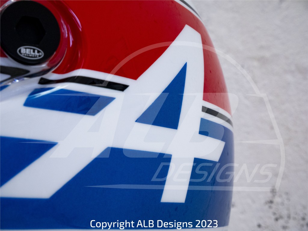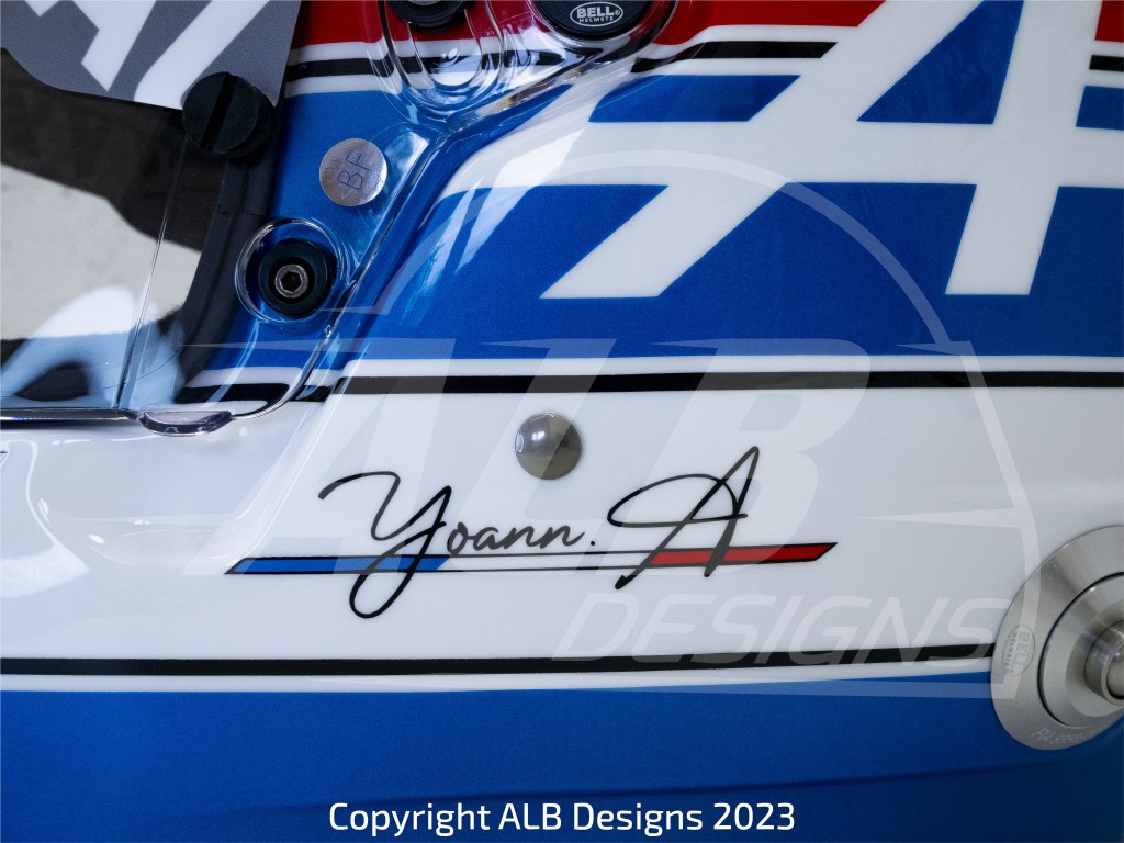 Création design et peinture sur un BELL GT5 SPORT, options bleu Alpine héritage et reproductions de logos