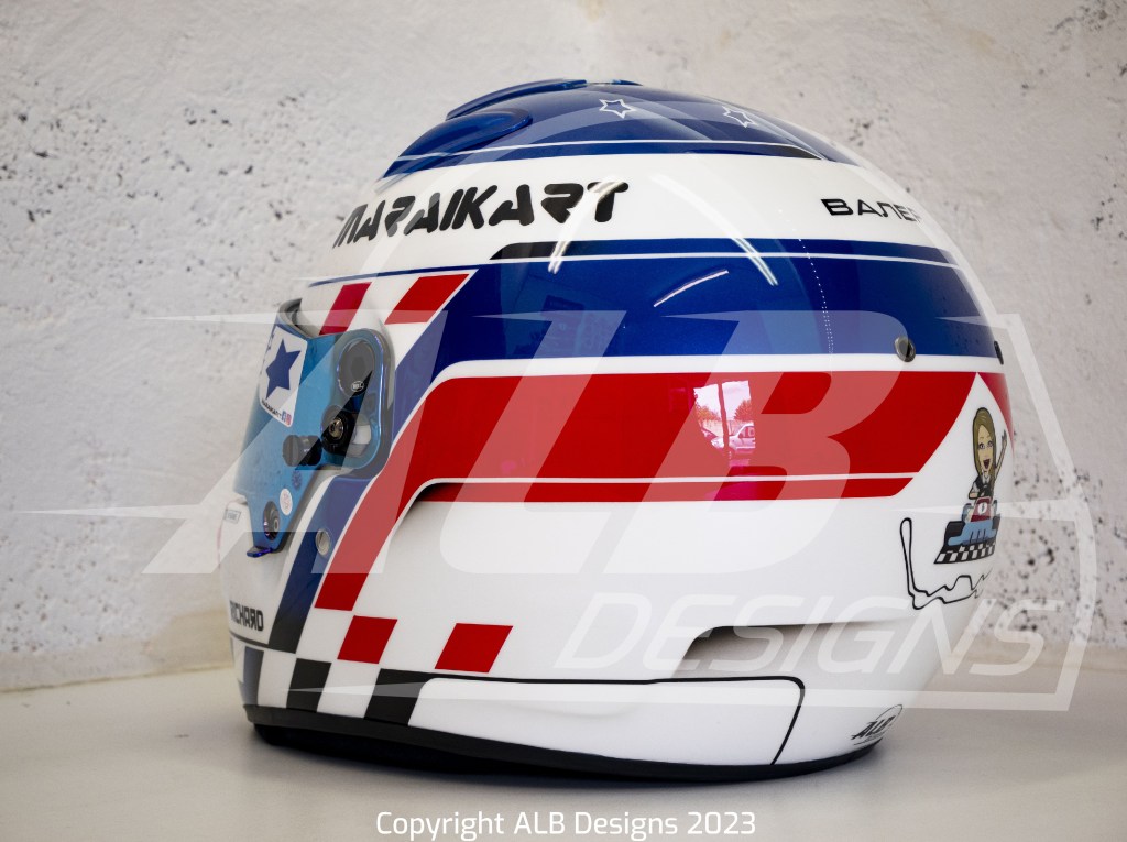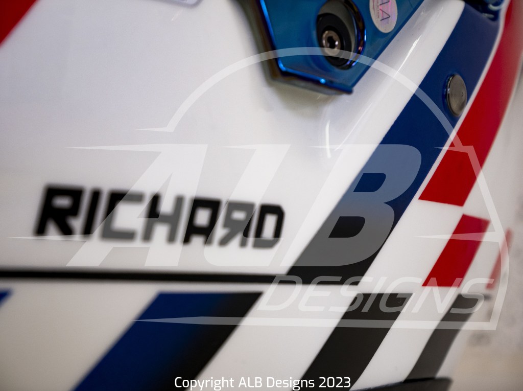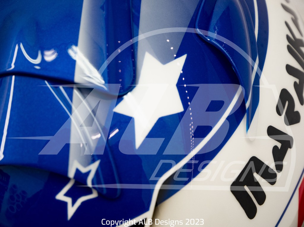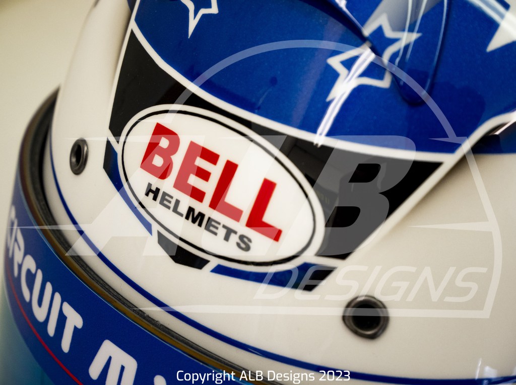 Création design et peinture sur un BELL RS7 K, options givre nacré, bleu iron, rouge flamme, prises d’air peintes et reproductions de logos