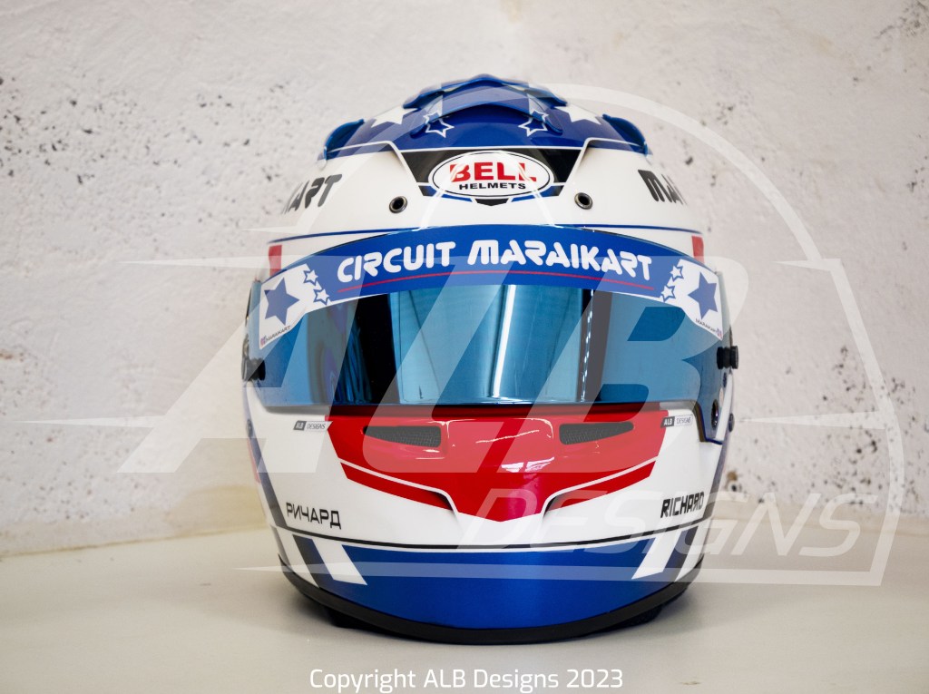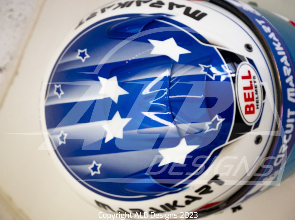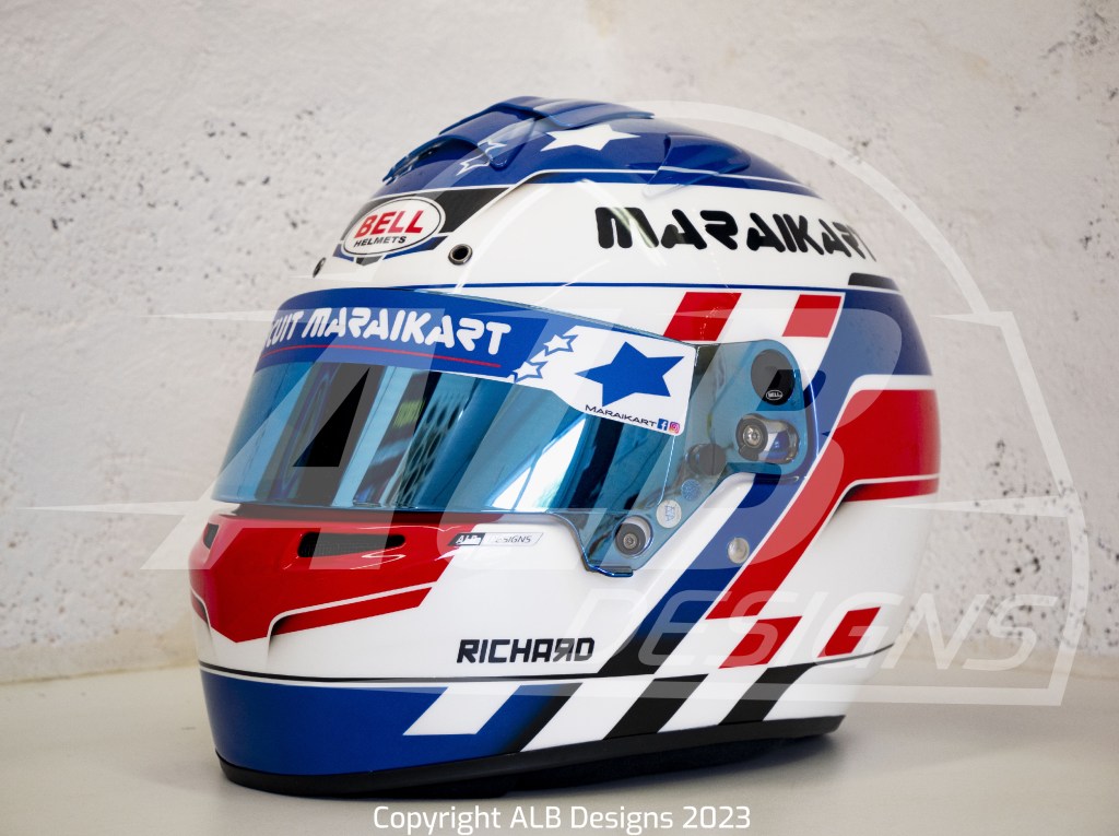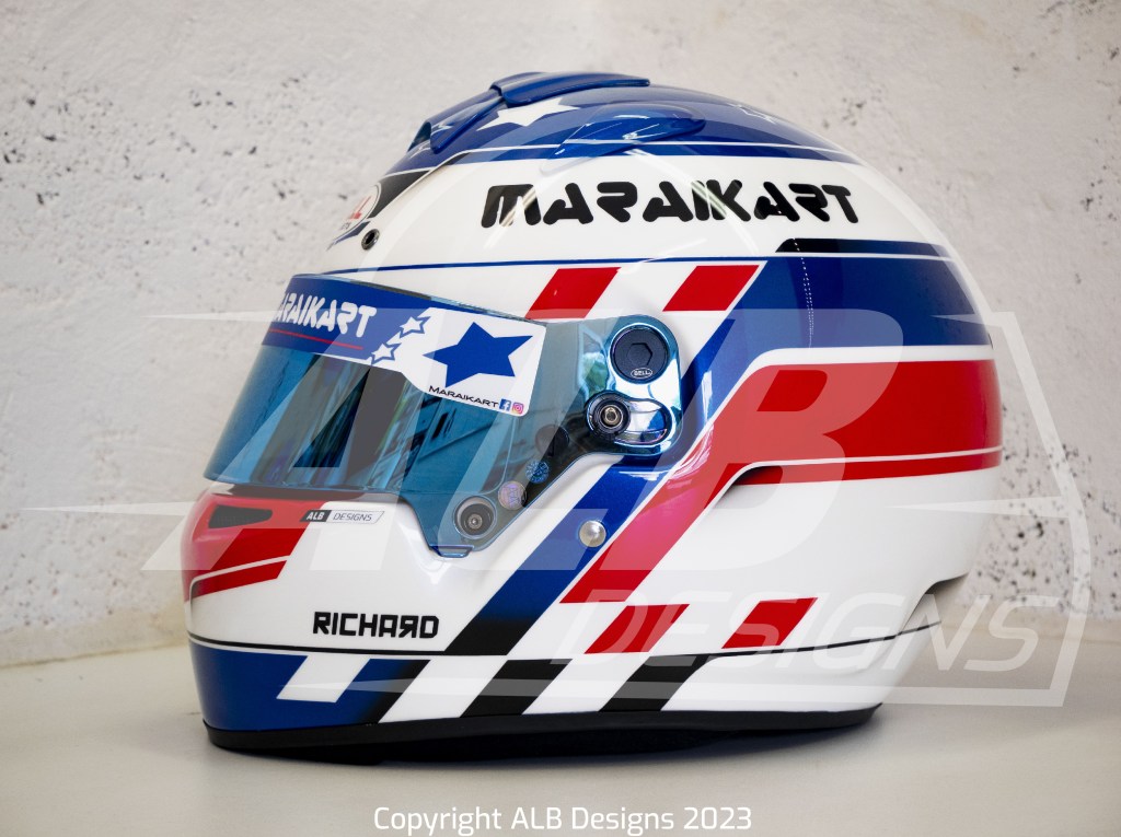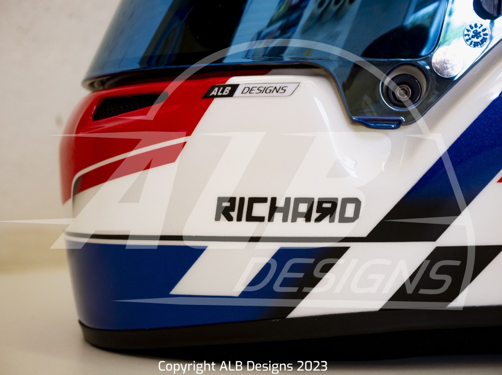 Création design et peinture sur un BELL RS7 K, options givre nacré, bleu iron, rouge flamme, prises d’air peintes et reproductions de logos