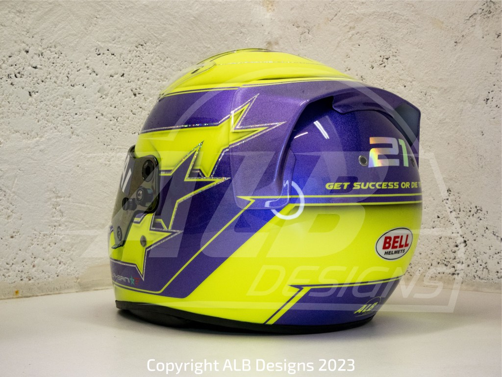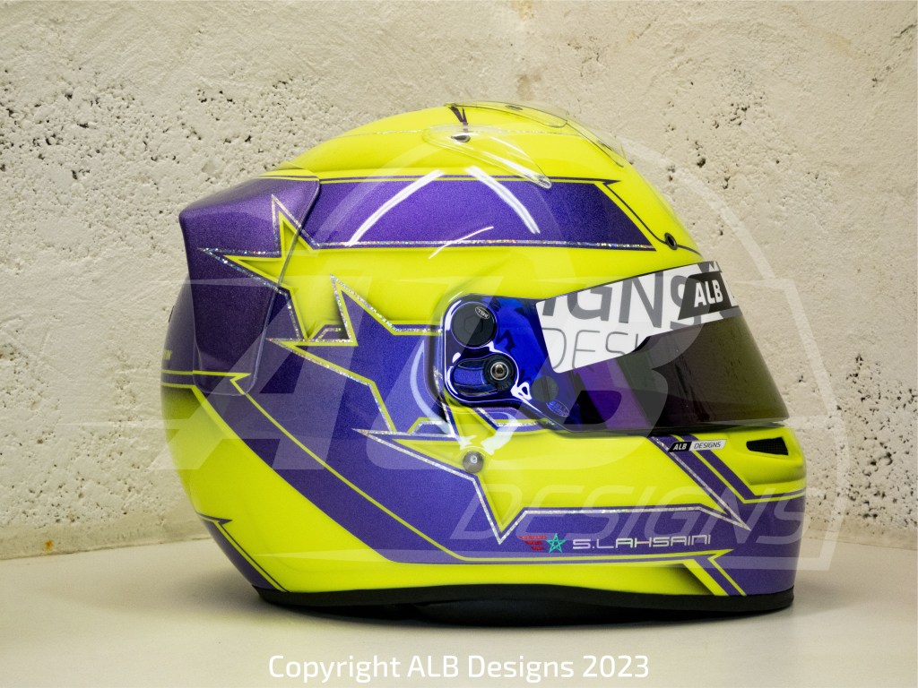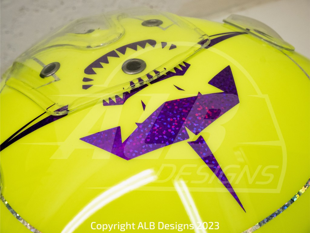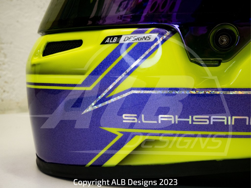 Création design et peinture sur un BELL KC7 CMR, options jaune fluo, violet métallisé, filets holographiques, logos holographiques métalliques, holographique violet et reproductions de logos