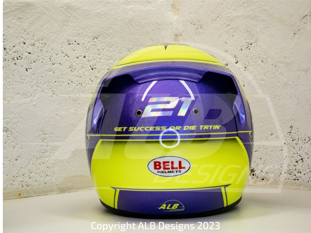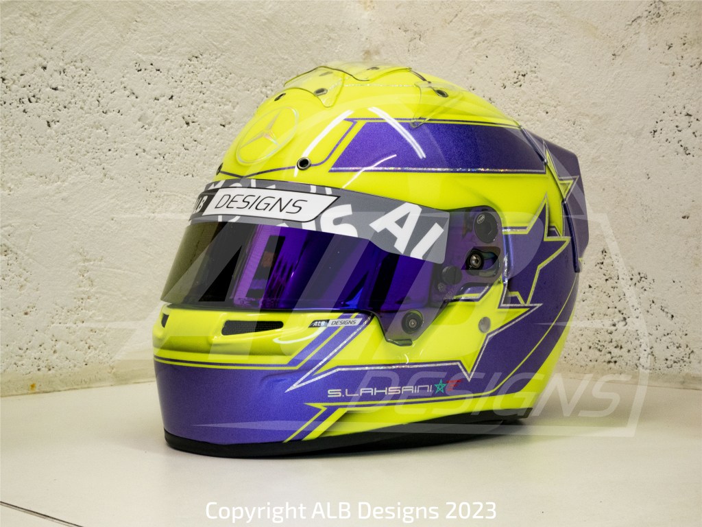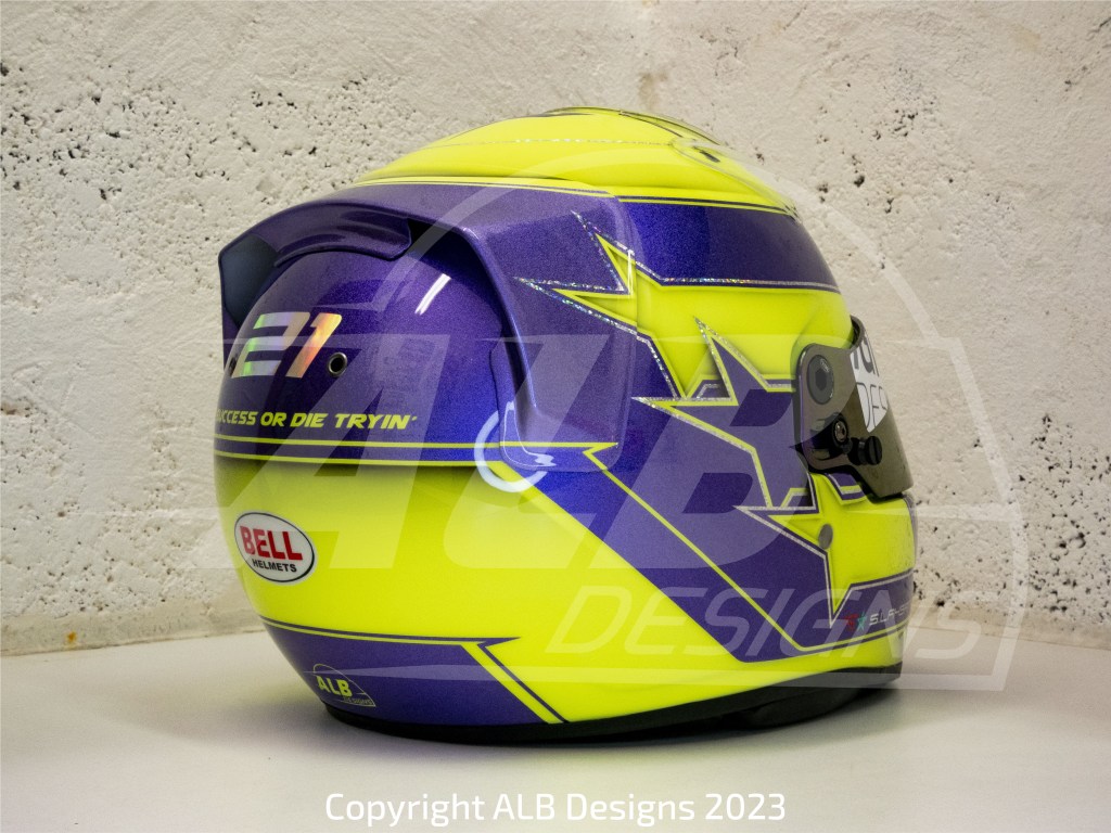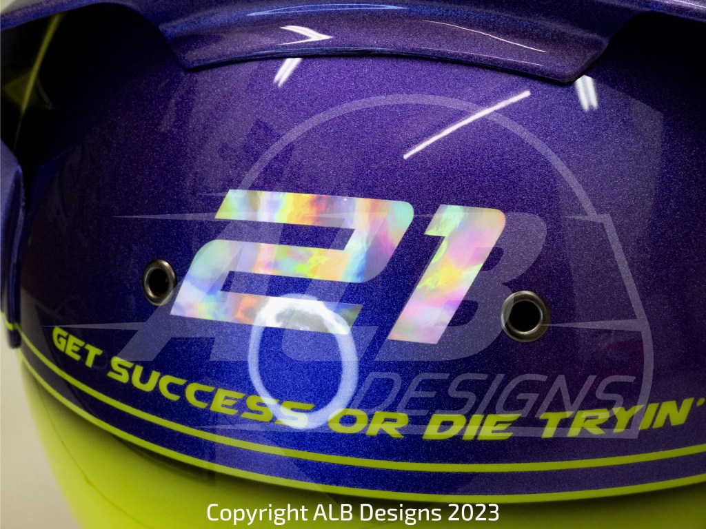 Création design et peinture sur un BELL KC7 CMR, options jaune fluo, violet métallisé, filets holographiques, logos holographiques métalliques, holographique violet et reproductions de logos