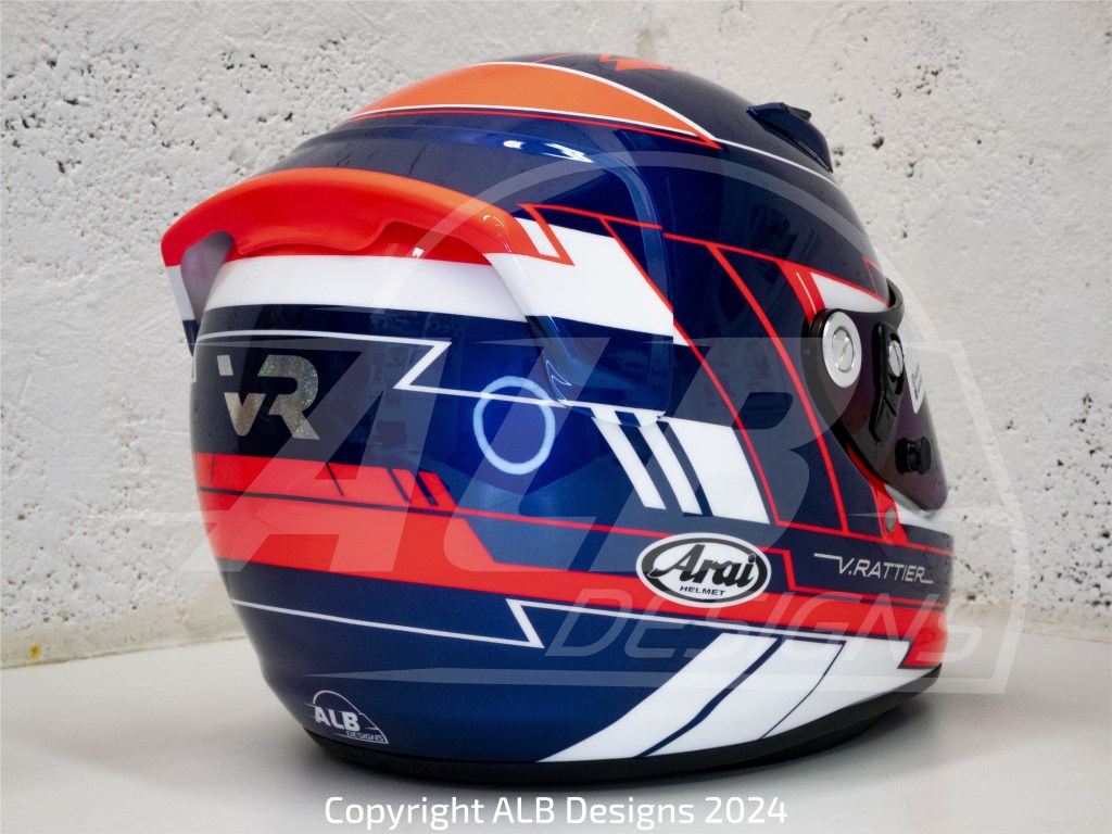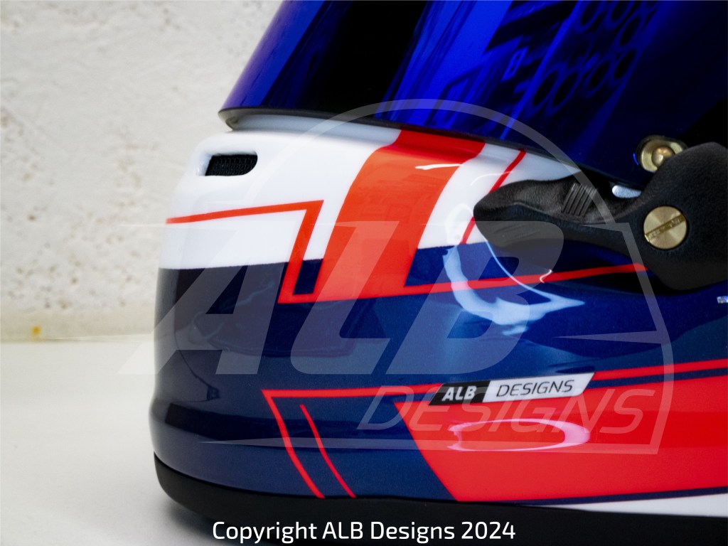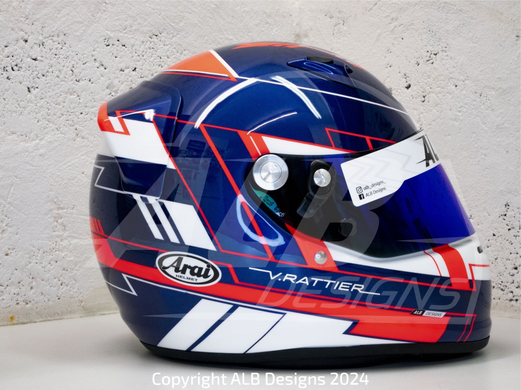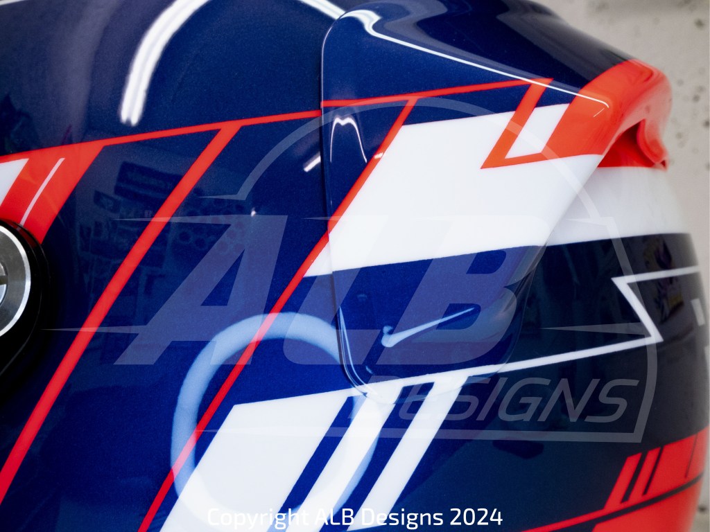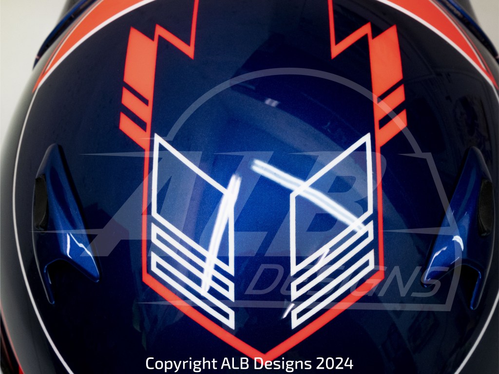 Création design et peinture sur un ARAI SK6, options bleu nuit nacré, rouge fluo, reproductions de logos, holographique et aileron peint
